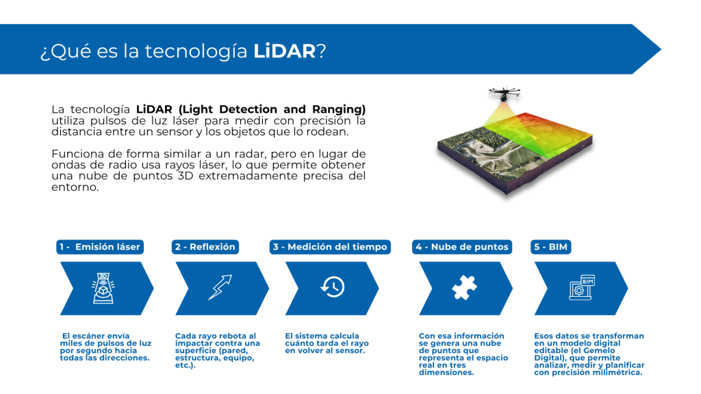 - Es una réplica virtual exacta de tus instalaciones físicas, creada a partir de un relevamiento 3D con tecnología LiDAR.